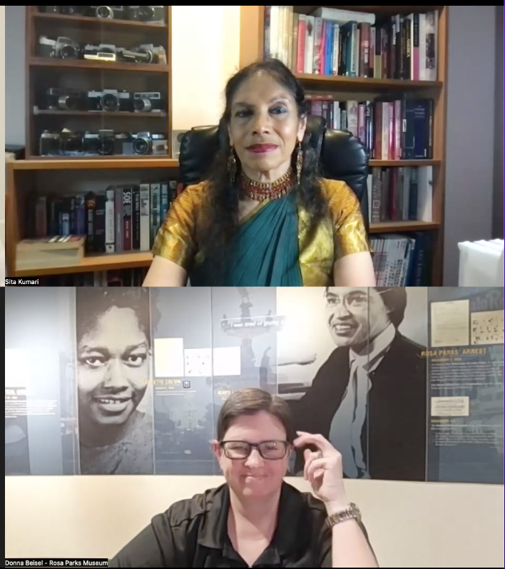 Now to Donna Beisel in Alabama, USA. Donna is pictured at left (lower image, speaking to Sitakumari, top image),the Director of the Rosa Parks Museum, which holds the original documents, films and other archived material connected with the Civil Rights Movement in the Southern USA of the 1950’s and 60’s and Martin Luther King. It was established in Montgomery, Alabama by Troy University working in partnership with community leaders and participants of the famous bus boycott of 1955 which brought Rosa Parks to fame. The Museum keeps the history alive. In this image, she is online with Sitakumari in a storytelling event in 2025 which led to the involvement of Rosa Parks Museum young people at their summer camp in the same year in the first Global Story Circle. The Global Story Circle is made up of groups using several Heartstone stories drawn from Cùra together with our book, The Heartstone Odyssey.